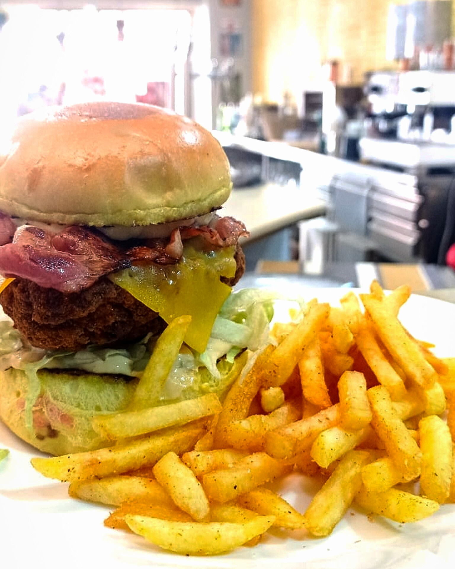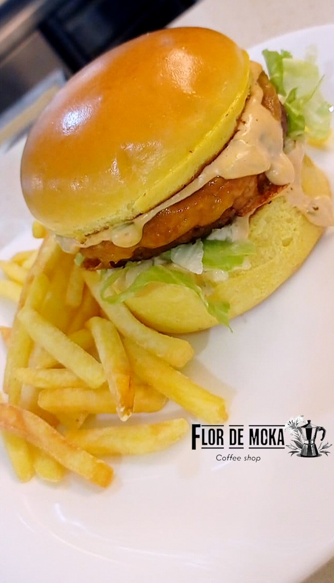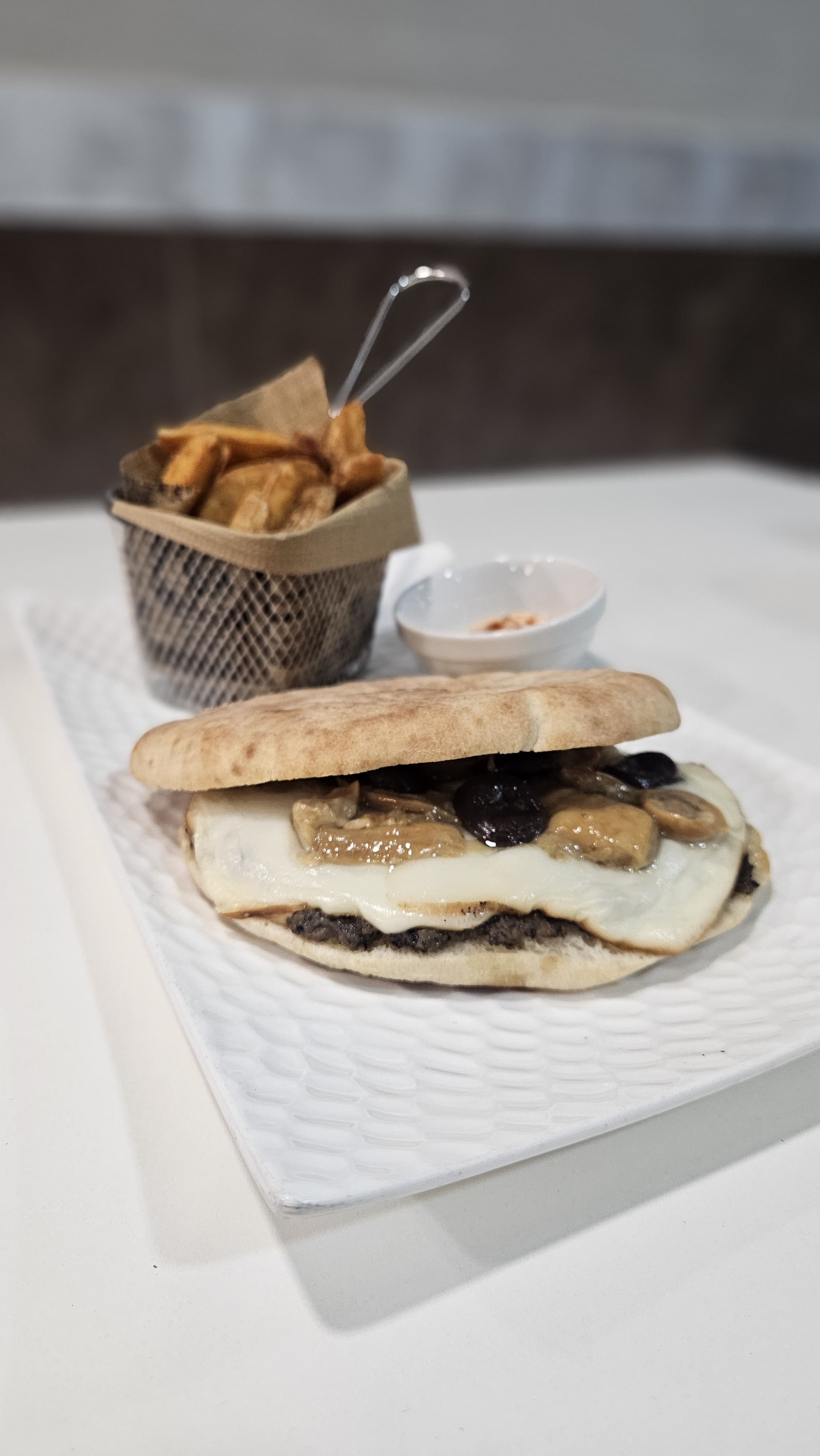Puccia artesanal rellena de sobrasada, queso Mahón, miel y nueces, una combinación suave y equilibrada con un toque crujiente. Incluye patatas fritas.