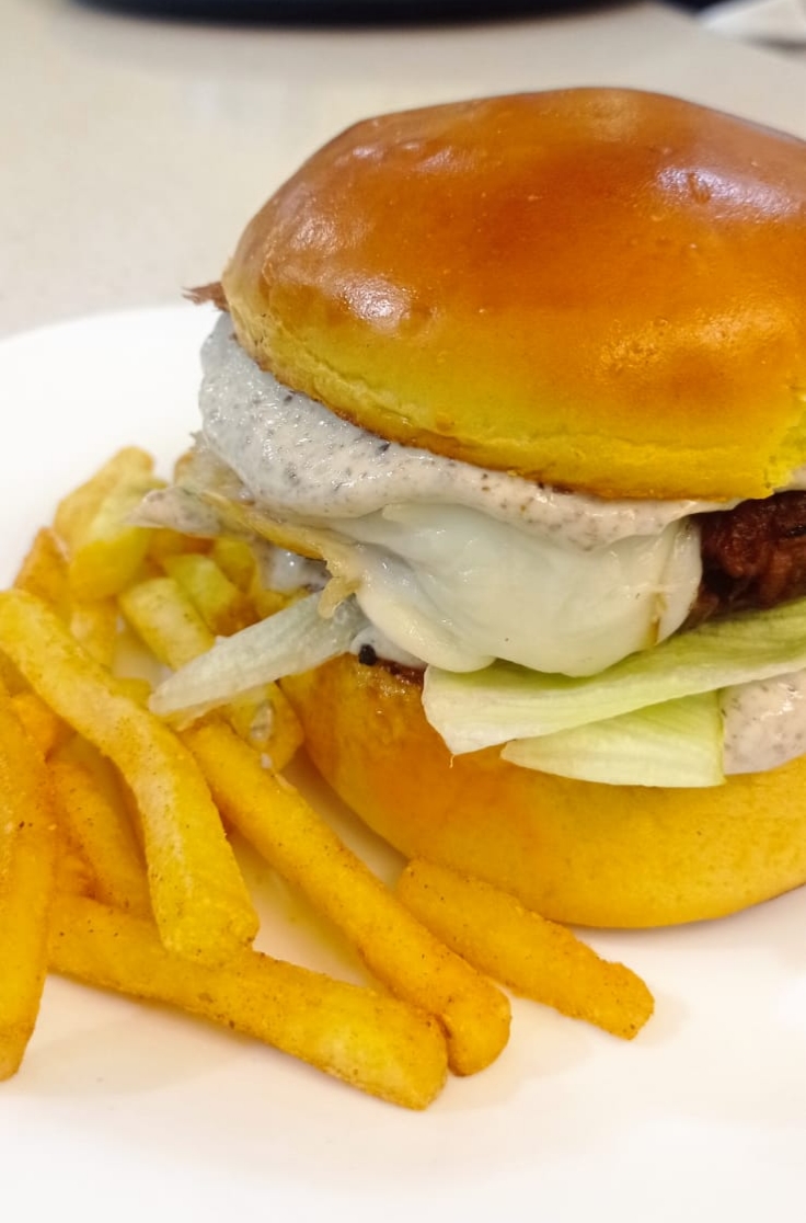 Pan brioche, carne Angus 180gr, queso scamorza ahumada y salsa trufada.
